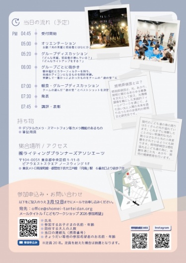 今回のテーマは『佃島の光の英雄と犯罪者探し&ライトアップ光を当てると闇に沈んでいたものがたちまち街のシンボルに!』です。自分たちが暮らしている町に『光の英雄と犯罪者』はいるのか。『光害』とは何か。自分たちの街に光害はあるのか。また『夜の闇に沈んでしまっているランドマーク』はどこに。こども達と一緒に探ります。